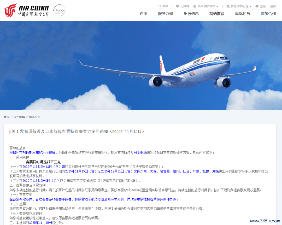国航在奉告中明确,关于在本年11月15日12时(含)前购买或换开产生新票号的国航999伊始的客票(包括里程奖励客票);客票未使用行程触及旅行日历为2025年11月15日(含)至2025年12月31日(含)之间东京、大阪、名古屋、福冈、仙台、广岛、札幌、冲绳收支港的国航推行承运航班和挂CA航班号的代码分享航班;在2025年11月15日0时(含)以后申宴客票变更或退票(以取消客票订座时间为准)。在客票灵验期内,初次变更免收变更手续费,但需收取子舱位差价及淡旺季差价,再次变更需依据客票使用要求办理。在客票灵验期内,不错办理未使用航段退票,免收退票手续费。