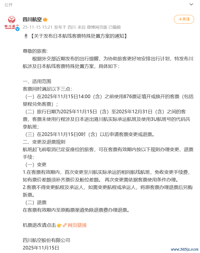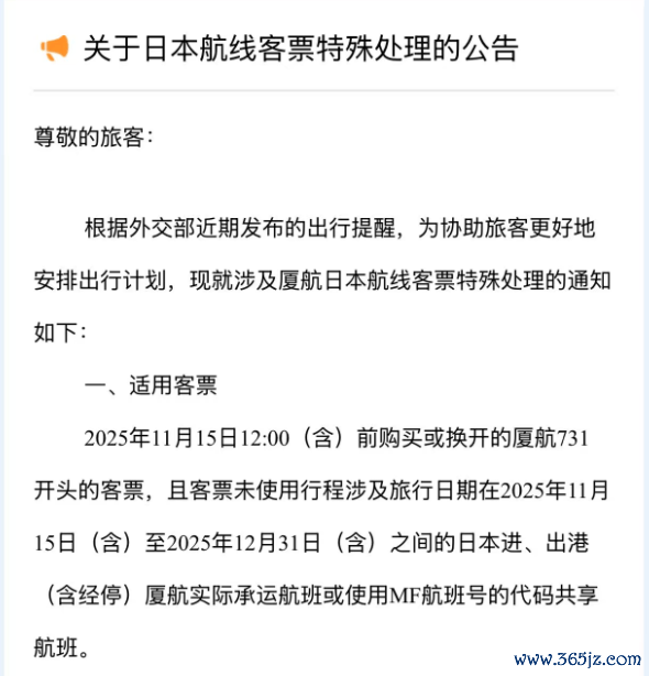 南航在奉告中明确,关于在本年11月15日12:00(含)前购买或换开的南航784伊始的客票,且客票未使用行程触及旅行日历在2025年11月15日(含)至2025年12月31日(含)之间的日本进、出港(含经停)南航推行承运航班或使用CZ航班号的代码分享航班,航班升起前取消已定妥座位的游客,在客票灵验期内苦求退票,免收退票费。初次变更至换取航程的南航推行承运航班,免收变更费,如发生票价价差按礼貌收取。