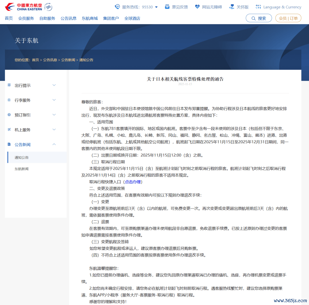 东航在奉告中明确,关于在本年11月15日12:00(含)前购买或换开的东航781客票填开的国外、地区或国内航班。客票中至少含有一段未使用的触及日本(包括但不限于东京、大阪、广岛、札幌、小松、鹿儿岛、长崎、新泻、冈山、福冈、静冈、名古屋、松山、冲绳、富山、熊本)进港、出港或经停航班(包括东航、上航或其他航空公司航班),航班升起日历在2025年11月15日至2025年12月31日历间,归并客票内的其他未使用航段日历不限。办理变更至原航班前后3天(含)以内的航班,可免费变更一次。再次变更或变更超出原航班前后3天(含)内的航班,需依据客票使用要求办理。在客票灵验期内,可至原购票渠谈办理未使用航段非自发退票,免收退票手续费。
