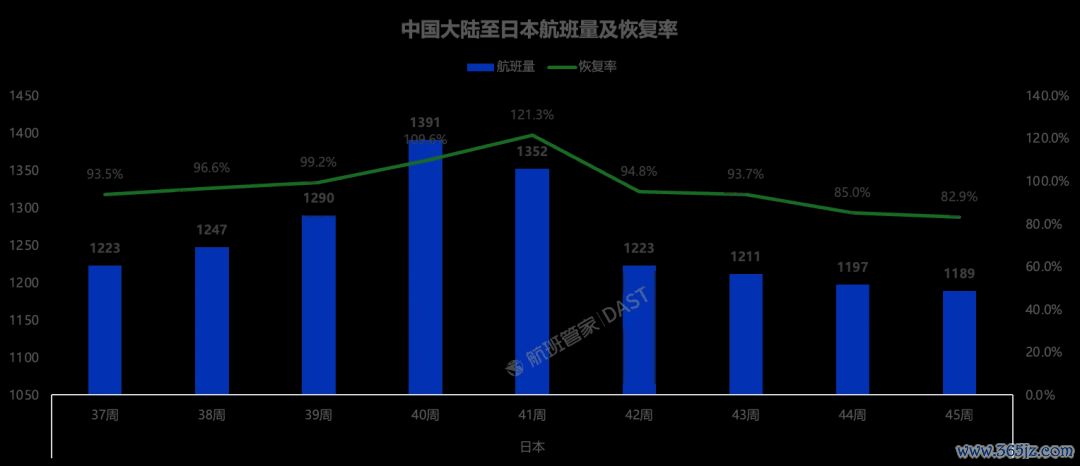 受民航换季及市集身分影响,中国大陆-日本周度航班量已大幅下滑,据航班管派系据,第45周(11.03-11.09)周航班量1189班次,复原率(较2019年同时)为82.9%,环比第40周着落14.5%。